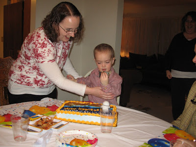Joseph turned three on Saturday. Unfortunately, there was an ice storm, so we had to delay his party until the next day after church. Joseph also has a really bad cold, so he wasn't in the best mood. His favorite part was blowing out the candles. We put the candles on his own piece of cake so he wouldn't get anyone else sick. He wanted us to re-light the candles so he could blow them out a second time and Jacob got a video of it.